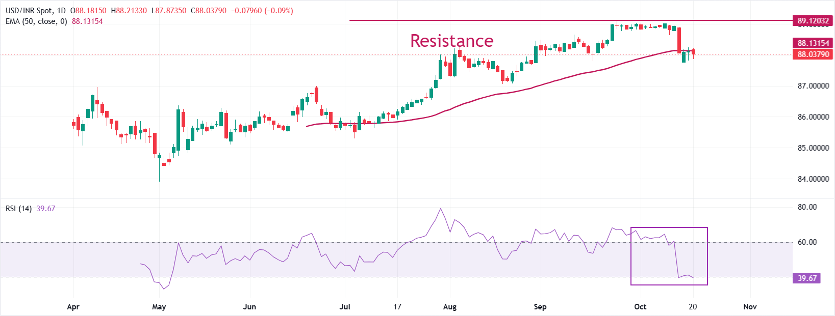 USD/INR started the week on a cautious note, dropping to near 88.00. The 50-day Exponential Moving Average (EMA) near 88.13 is acting as a key barrier for the USD/INR bulls.
